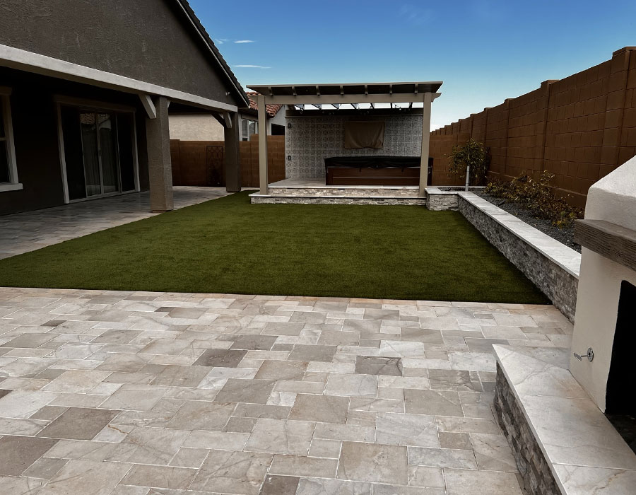 Our team approached this project with a focus on blending comfort with performance. The outdoor kitchen and fireplace became natural gathering hubs, while the synthetic turf reduced maintenance and added vibrant greenery. The hot tub enclosure and media wall gave the backyard a resort-inspired feel, making it a versatile retreat for both daytime fun and evening relaxation.
