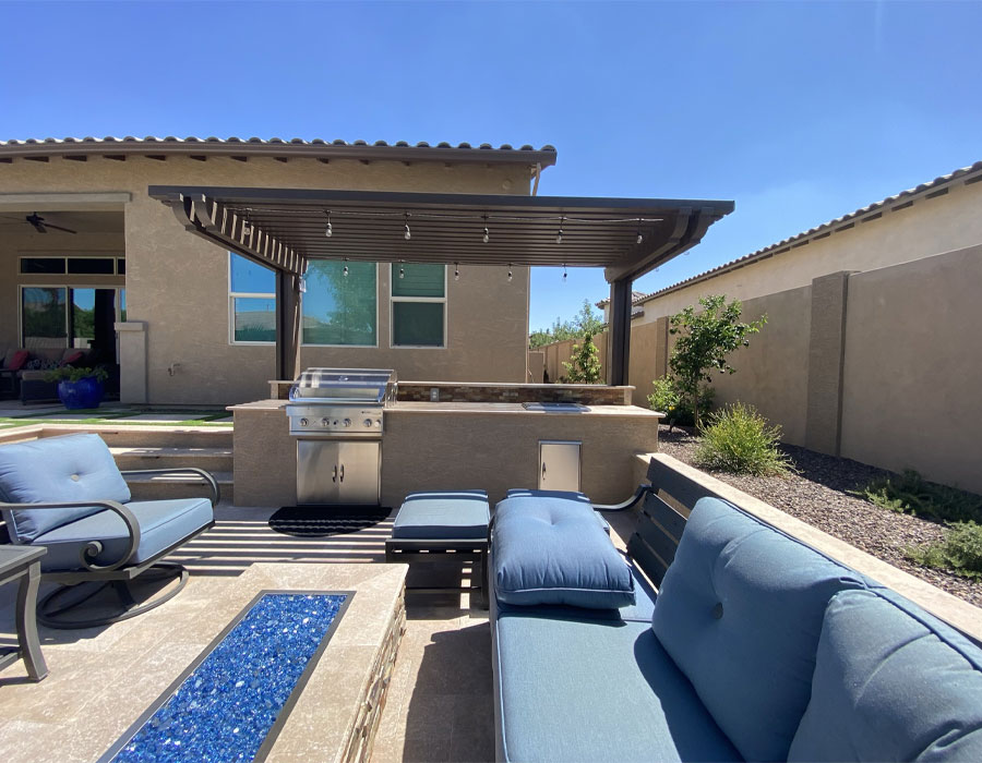From the elegant Travertine deck to the vibrant greenery, this project blends hardscape and landscape for maximum visual appeal and usability. The sunken outdoor kitchen became the focal point for gatherings, while the putting green added a playful, functional element. With its combination of water, fire, stone, and greenery, the Peach Tree project showcases the best of Arizona outdoor living.