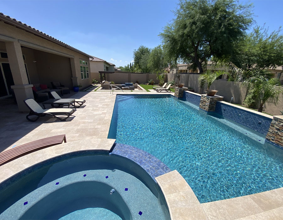 The putting green was installed around the pool to maximize space and provide year-round recreation. Tropical plants were added to soften the hardscapes and bring lush greenery to the desert setting. Together, these elements created a balanced, resort-style backyard that offers beauty, entertainment, and lasting durability.