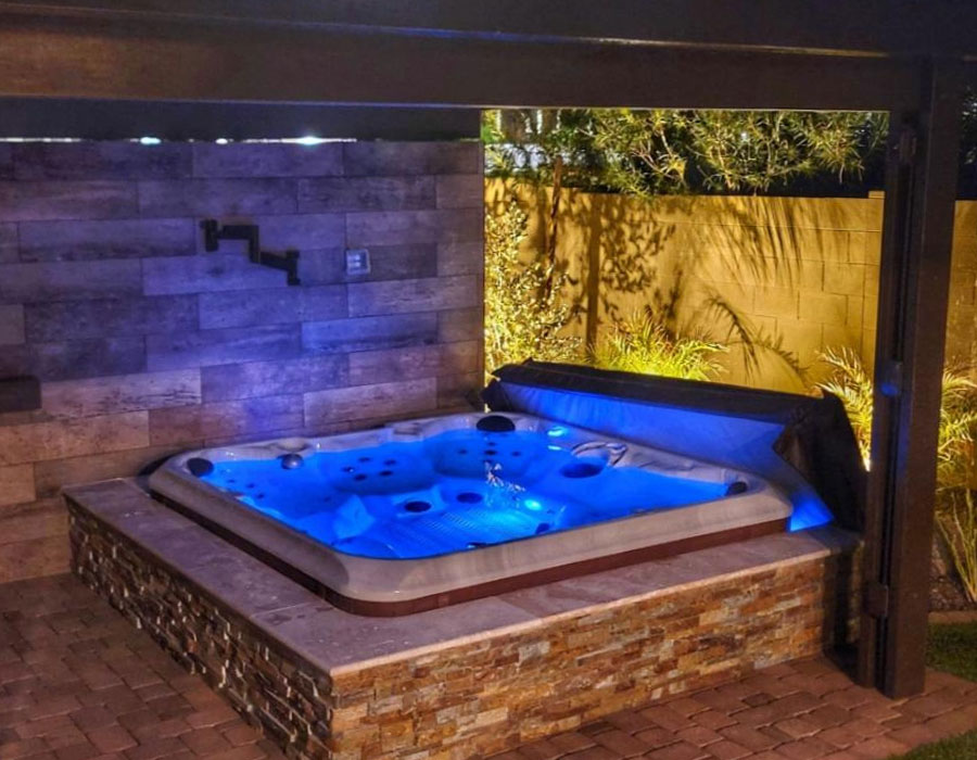 The Thatcher project turned an ordinary backyard into a versatile, entertainment-ready space with custom features designed for comfort and style. This build included a covered hot tub enclosure paired with a media wall, a desert-inspired fire pit area, synthetic turf for low-maintenance greenery, Belgard pavers for durability, and integrated LED lighting to enhance both ambiance and safety.